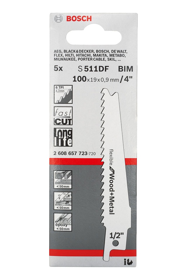 Siinä on 1/2 tuuman yleisvarsi. S 511 DF Flexible for Wood and Metal -puukkosahanterä leikkaa puuta ja metallia nopeasti.